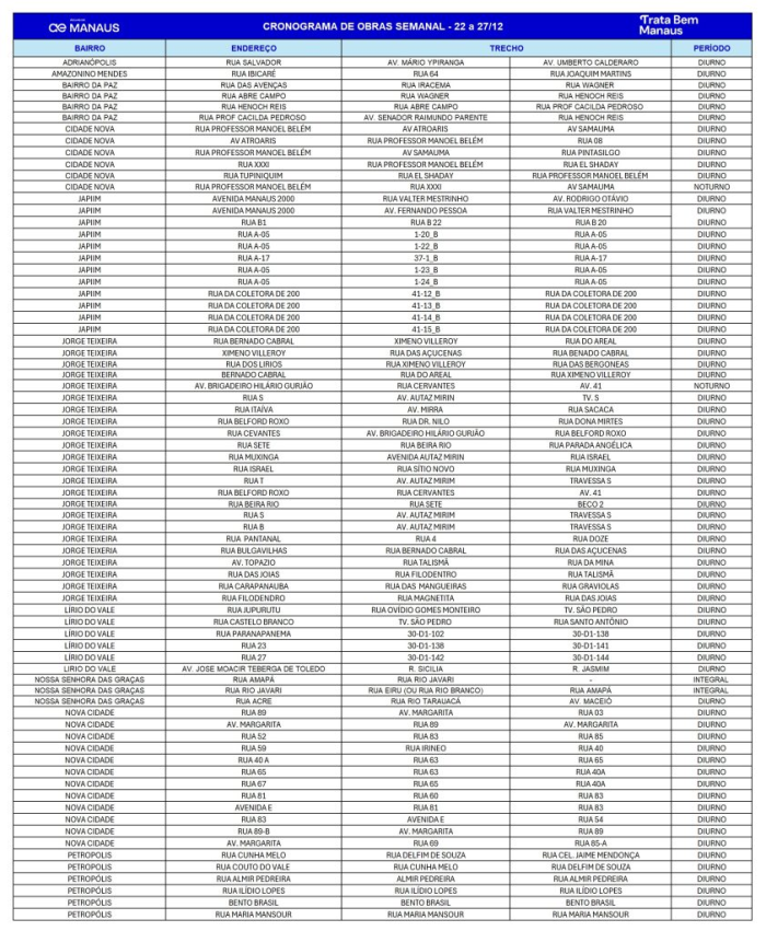 Veja o cronograma de obras de 22 a 27 de dezembro: